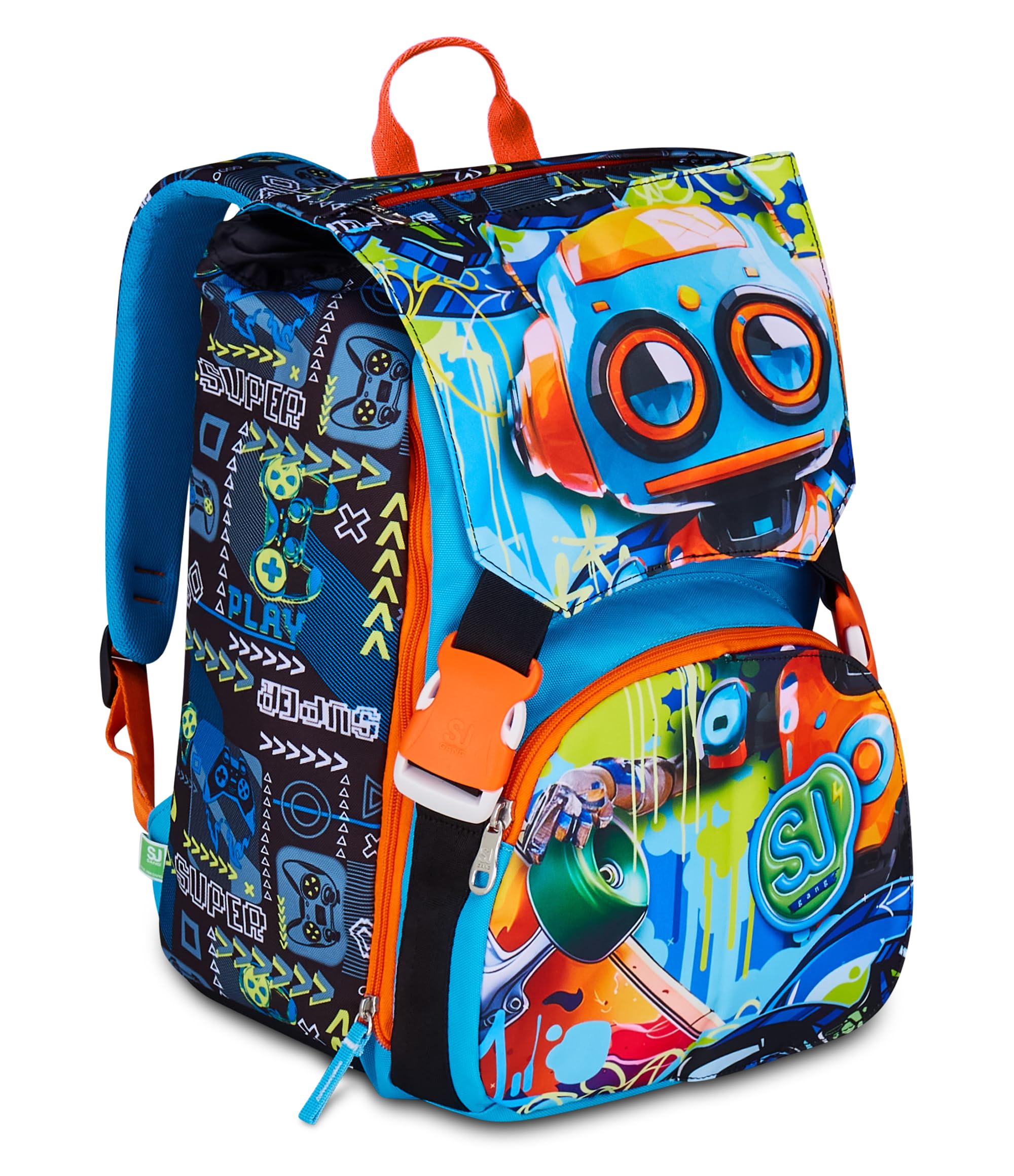 SJ Gang STYLE JAM GANG grande zaino scolastico spiegizabile a colori, blu, con divisore interno, tasca superiore con fia
